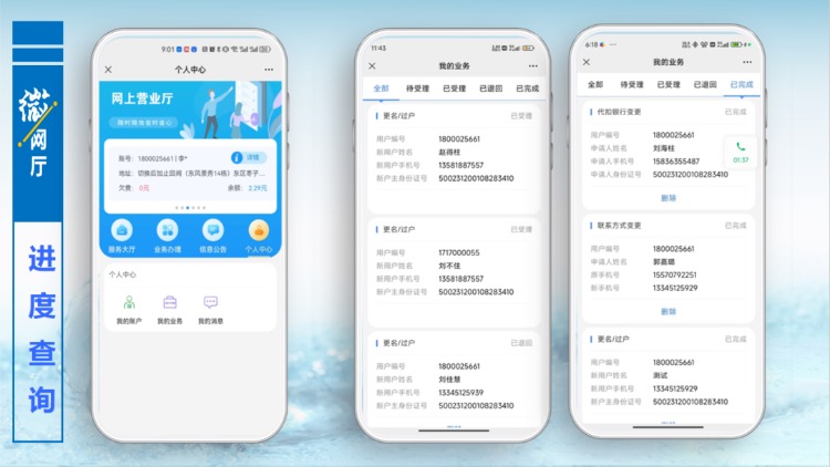 以更名過戶為例,用戶點(diǎn)擊更名過戶功能按鈕,進(jìn)入提交資料界面,按照頁面提示,填寫相關(guān)信息和拍照上傳附件,提交預(yù)約,后臺(tái)管理人員審核通過,便完成更名過戶辦理,用戶無需再到營(yíng)業(yè)大廳線下辦理任何手續(xù)。